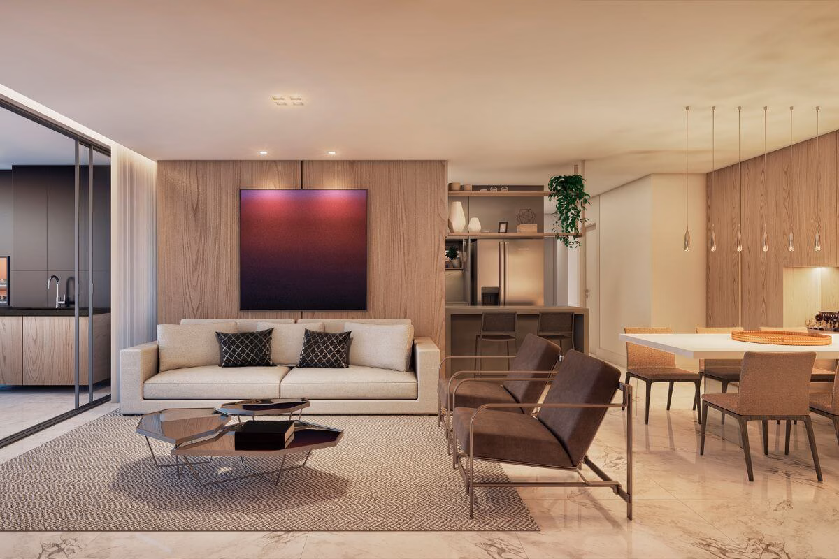 Nesse layout, a marcenaria e a decoração assumem papel de destaque, pois são responsáveis por delimitar visualmente os diferentes setores. A proposta está alinhada aos conceitos da arquitetura moderna e tem ganhado cada vez mais espaço, influenciada por referências da mídia — como as cozinhas com ilha e salas integradas.