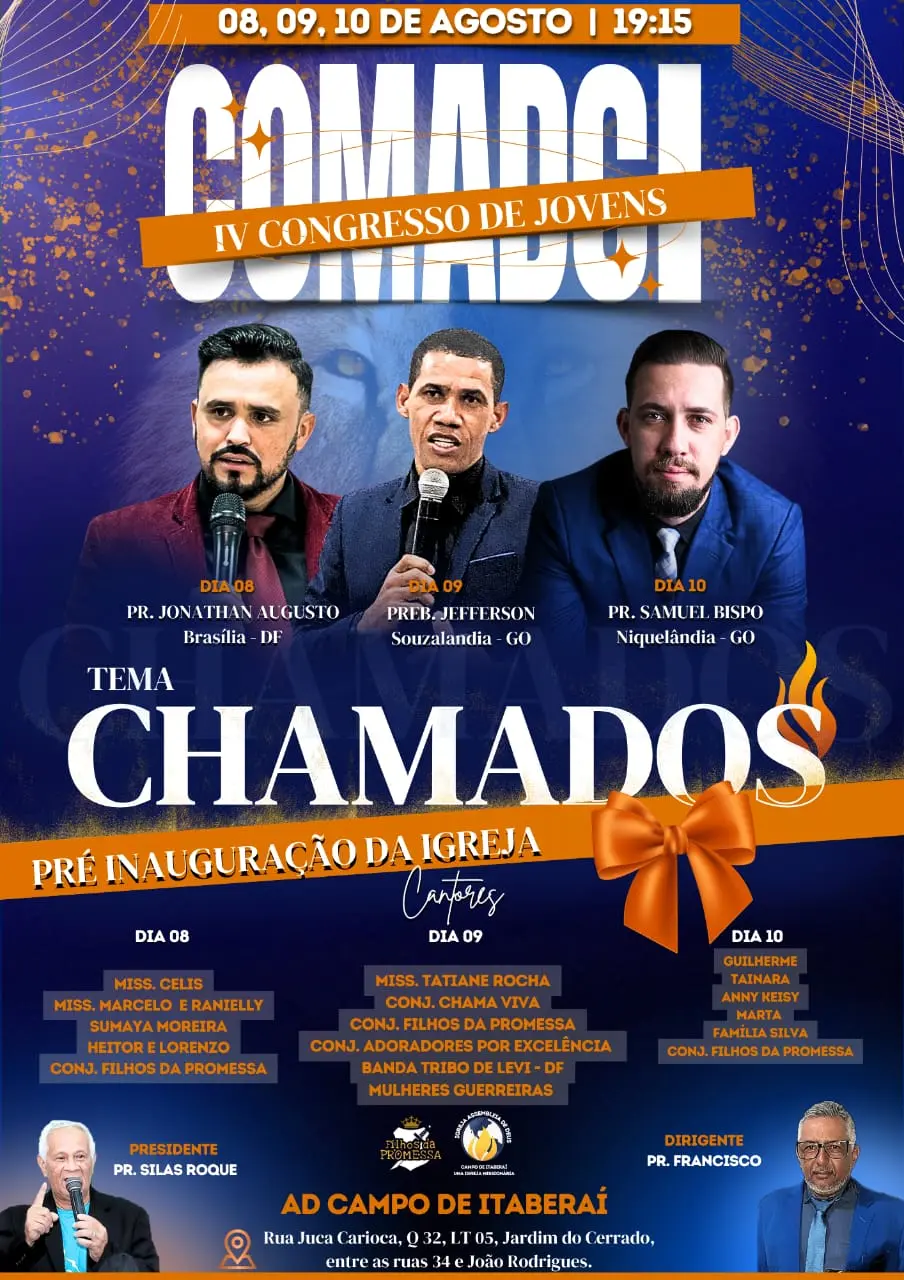 A Assembleia de Deus Campo de Itaberaí promove nos dias 08, 09 e 10 de agosto, a partir das 19h15, o IV Congresso de Jovens – COMADCI, com o tema “Chamados”. O evento acontece na sede da igreja, que está em fase de pré-inauguração, localizada na Rua Juca Carioca, Q 32, LT 05, Jardim do Cerrado, entre as ruas 34 e João Rodrigues.