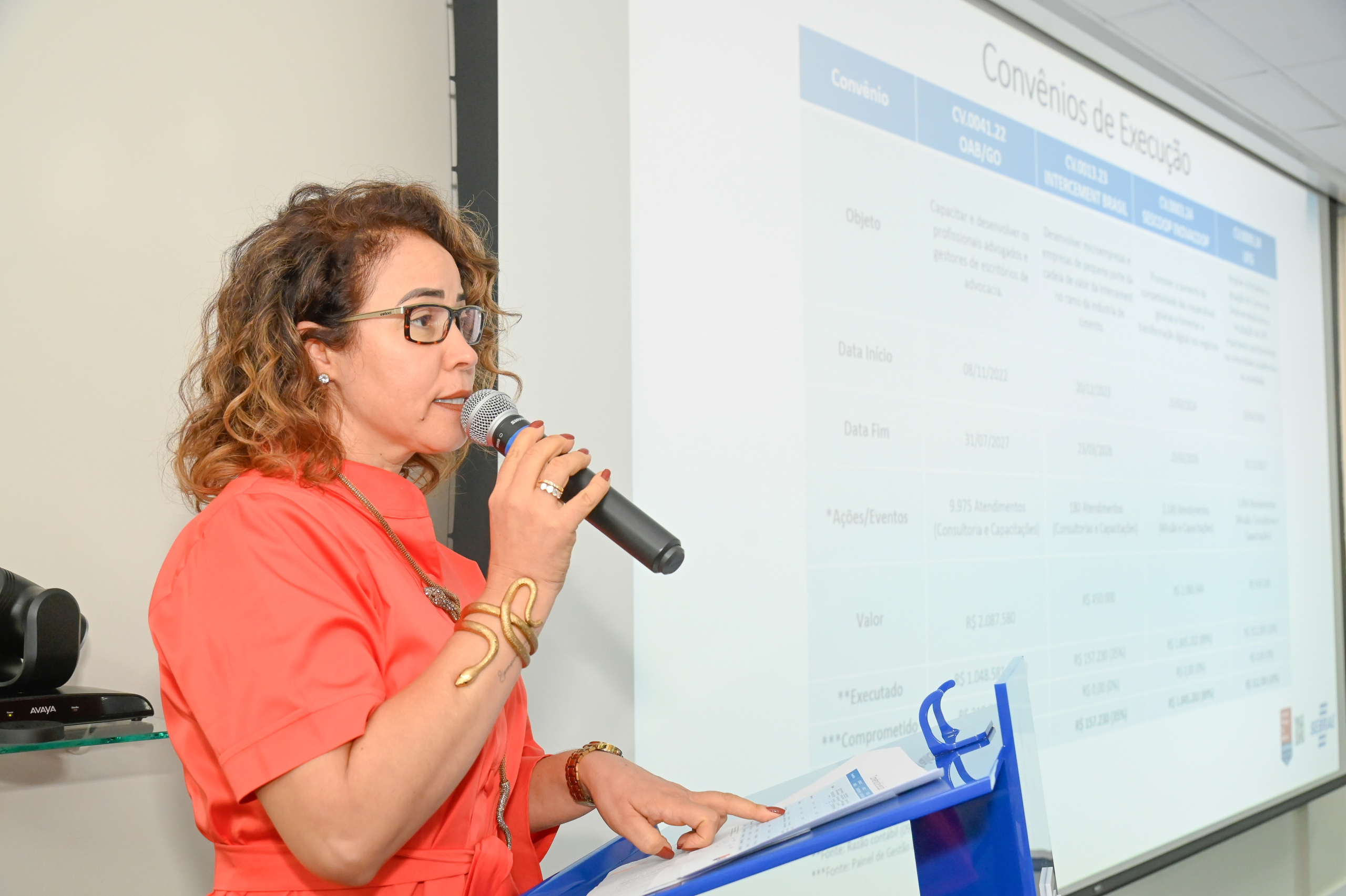 Após apresentação, a gerente da Unidade de Finanças Veronice Costa apresentou o Relatório Bimestral de Convênios. Atualmente, o Sebrae Goiás mantém 162 convênios ativos, com destaque para as 126 Salas do Empreendedor e parcerias com OAB, UFG e sistemas sindicais.