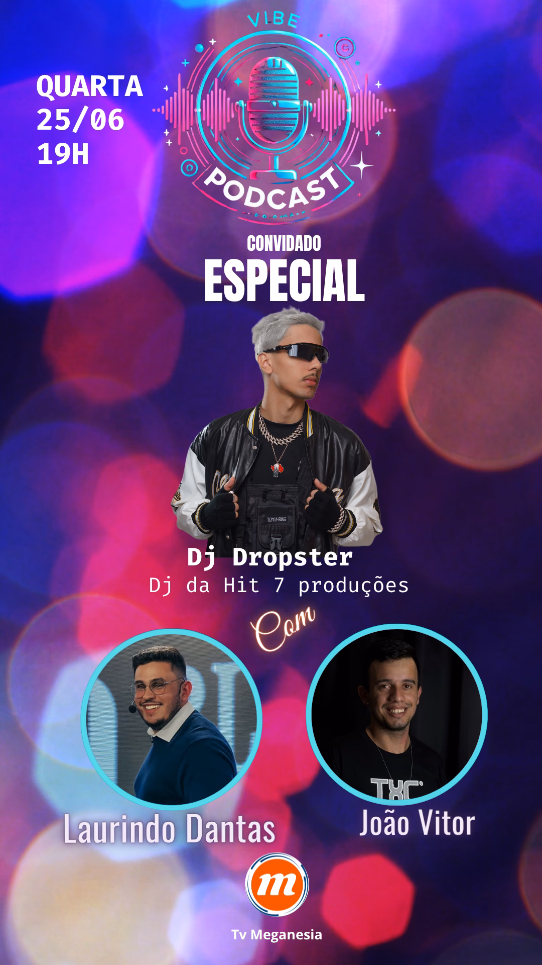 Na noite desta quarta-feira, 25, o Vibe Podcast apresenta uma edição especial com a participação de DJ Dropster, artista em ascensão no cenário musical goiano e integrante da Hit 7 Produções. O programa vai ao ar às 19h00 e promete uma conversa descontraída e informativa sobre música, carreira, bastidores da produção artística e desafios da cena cultural atual.