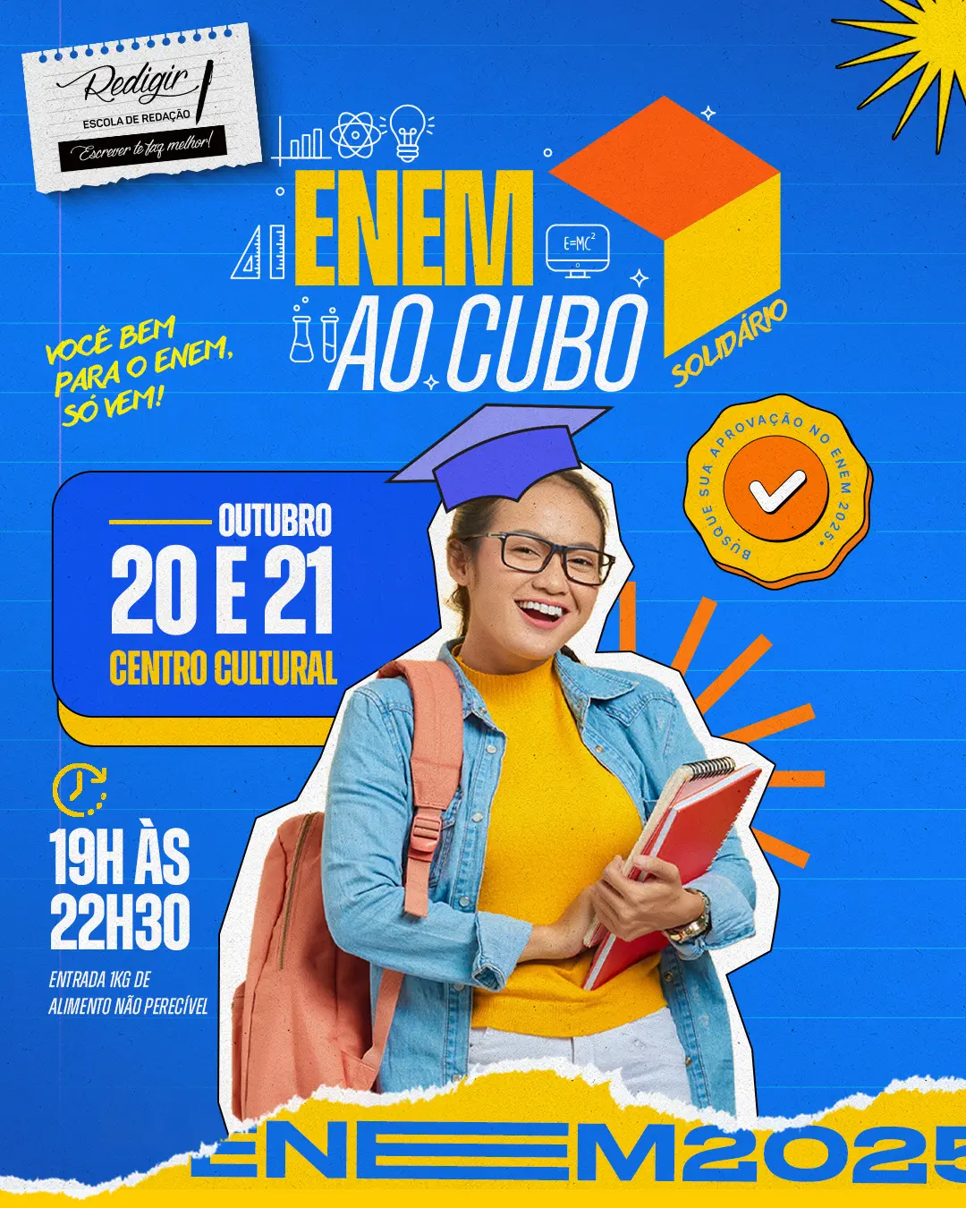 Nos dias 20 e 21 de outubro, o Centro Cultural Berchiolina Rodrigues, em Goianésia, será palco de mais uma edição do Enem ao Cubo, um evento que já se tornou uma tradição na cidade. Desta vez, a edição será solidária, onde os participantes poderão contribuir com 1 kg de alimento não perecível para ter acesso aos aulões de Redação e revisão de conteúdo que serão ministrados pela professora Patrícia Nara, da Redigir, Escola de Redação.