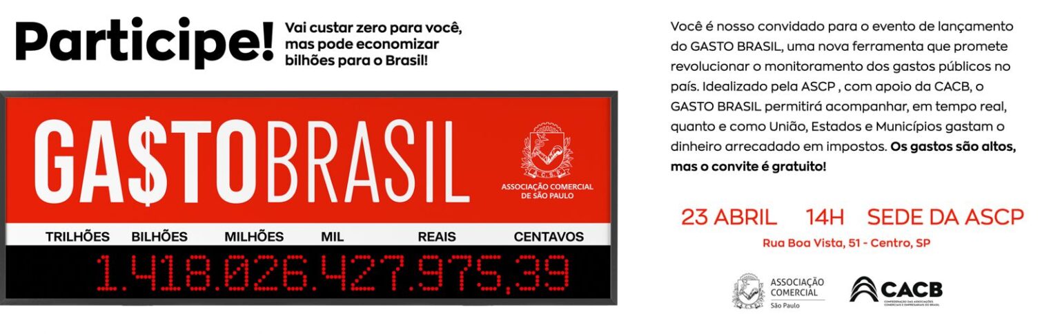 Nesta quarta-feira (23), a Confederação das Associações Comerciais e Empresariais do Brasil (CACB) e a Associação Comercial de São Paulo (ACSP) lançam oficialmente o Gasto Brasil, uma nova ferramenta para acompanhamento, em tempo real, dos gastos públicos nas esferas federal, estadual e municipal. O evento será realizado às 14h, no histórico Pateo do Collegio, localizado no centro da capital paulista.