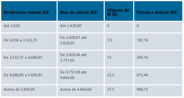 Para os brasileiros que ganham acima de R$ 3.036, a tributação começa a incidir em faixas – que chegam a um imposto de 27,5% sobre a renda mensal que ultrapassar os R$ 4.664,68.