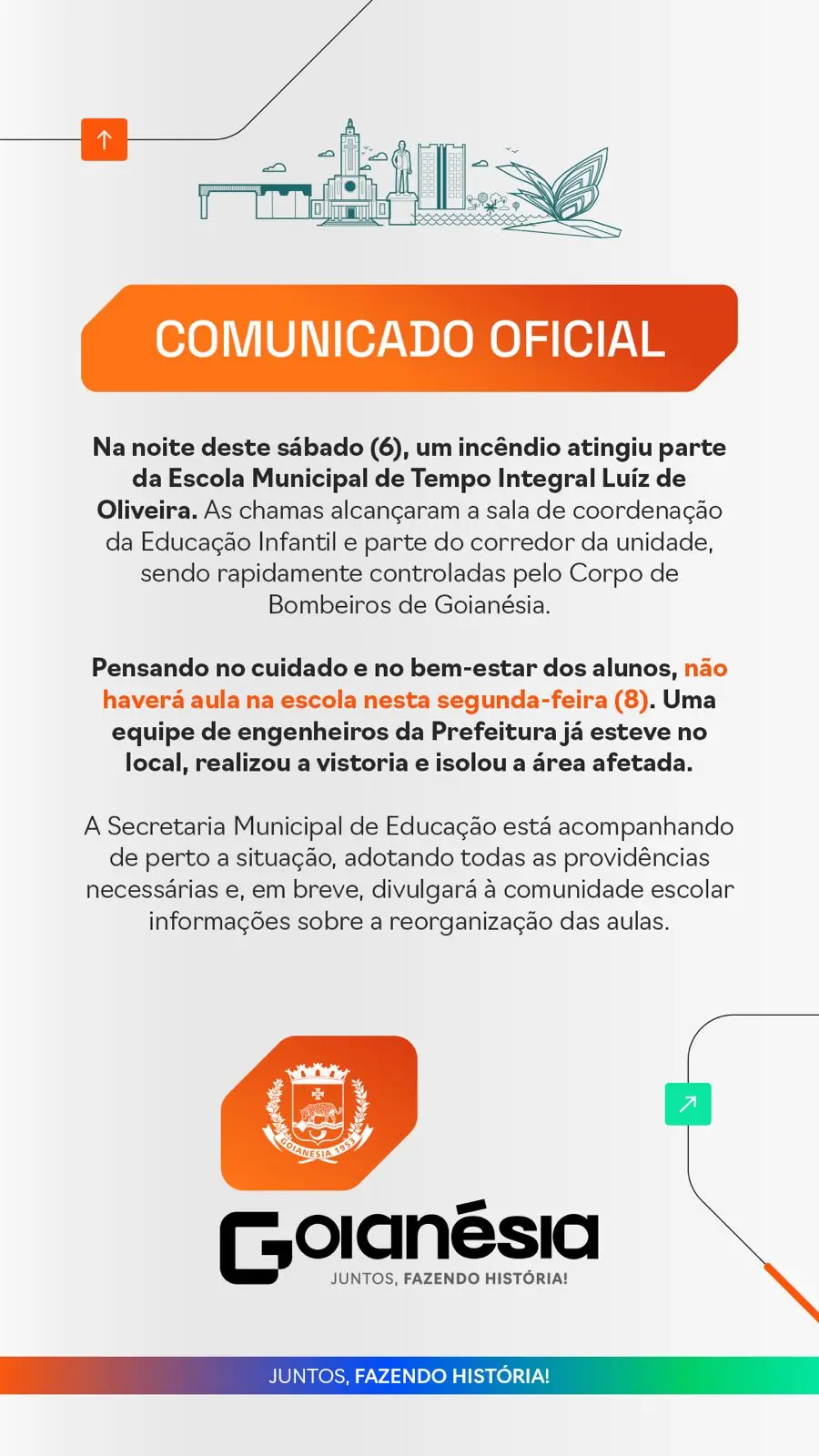 Em outra parte, o comunicado informa que “A Secretaria Municipal de Educação está acompanhando de perto a situação, adotando todas as providências necessárias e, em breve, divulgará à comunidade escolar informações sobre a reorganização das aulas”.