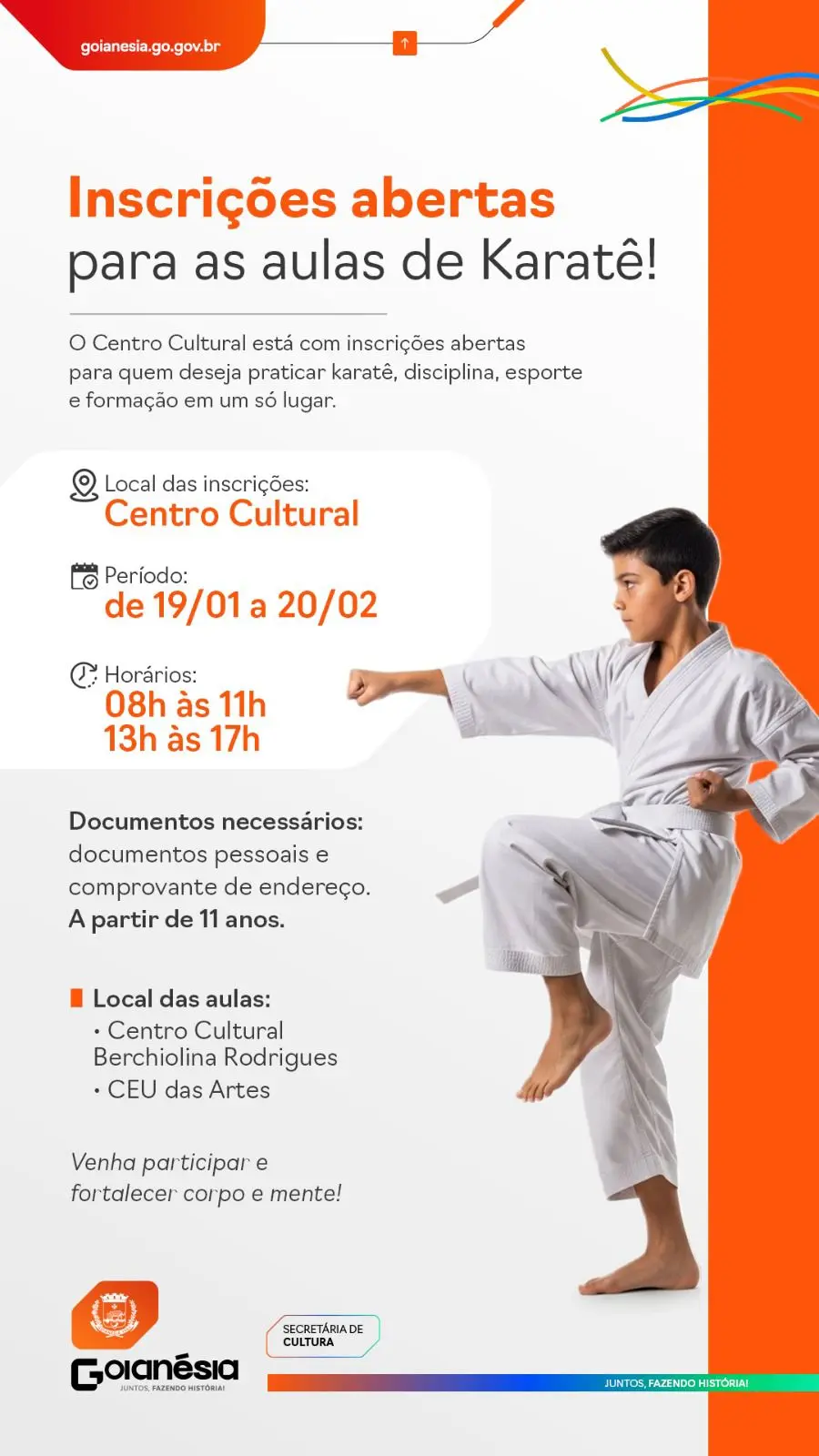 Estão abertas as inscrições para aulas gratuitas de karatê em Goianésia. A iniciativa é promovida pelo Centro Cultural, com foco na prática esportiva, disciplina e formação pessoal, atendendo crianças, adolescentes e adultos a partir de 11 anos.
