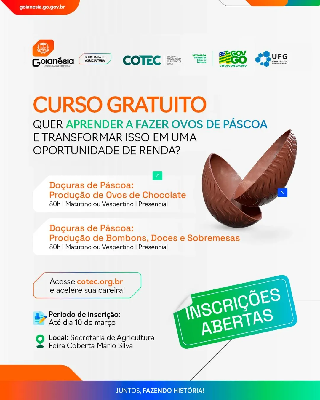 A Secretaria de Agricultura de Goianésia está promovendo um curso gratuito de Ovos de Páscoa, voltado para aqueles que desejam aprender a produzir essas iguarias e, ao mesmo tempo, garantir uma renda extra durante a Páscoa. As inscrições estão abertas até o dia 10 de março, e a iniciativa visa capacitar os participantes, também, em técnicas de confeitaria específicas para a produção de bombons, doces e sobremesas.