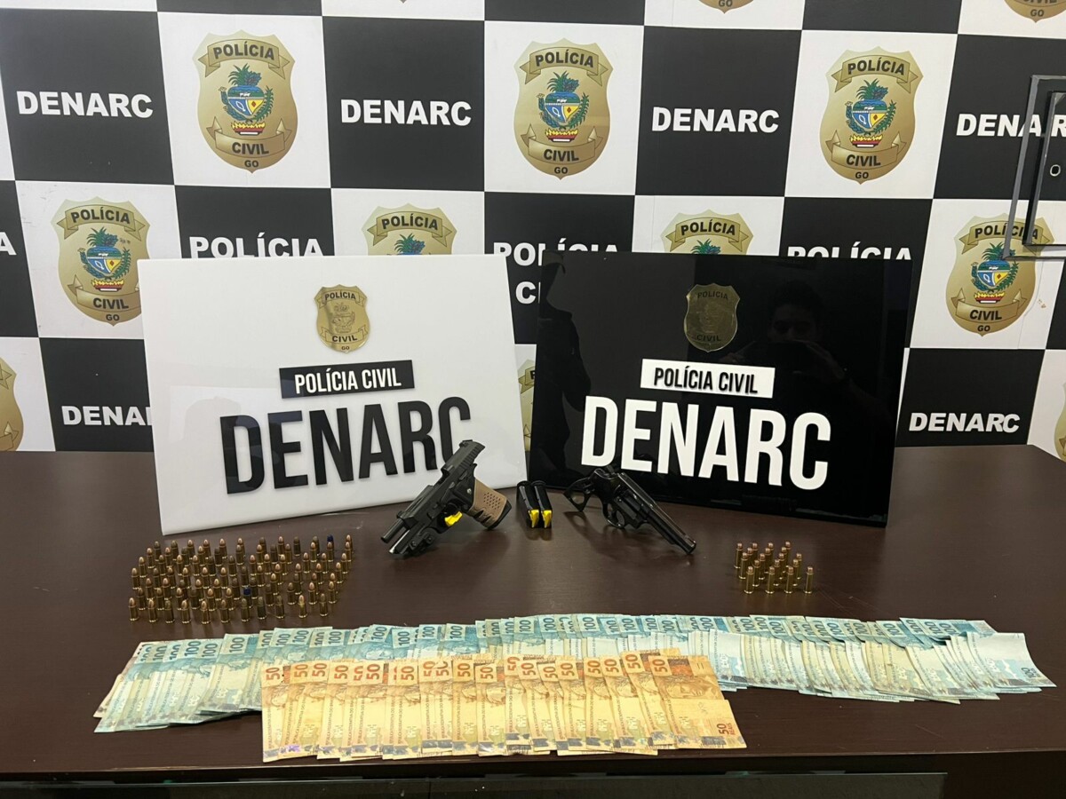 No interior de sua casa, localizada no setor Parque Amazônia, em Goiânia, foram apreendidas uma pistola calibre 9mm, um revólver calibre .38, mais de R$ 10 mil em dinheiro, e porções de drogas.
