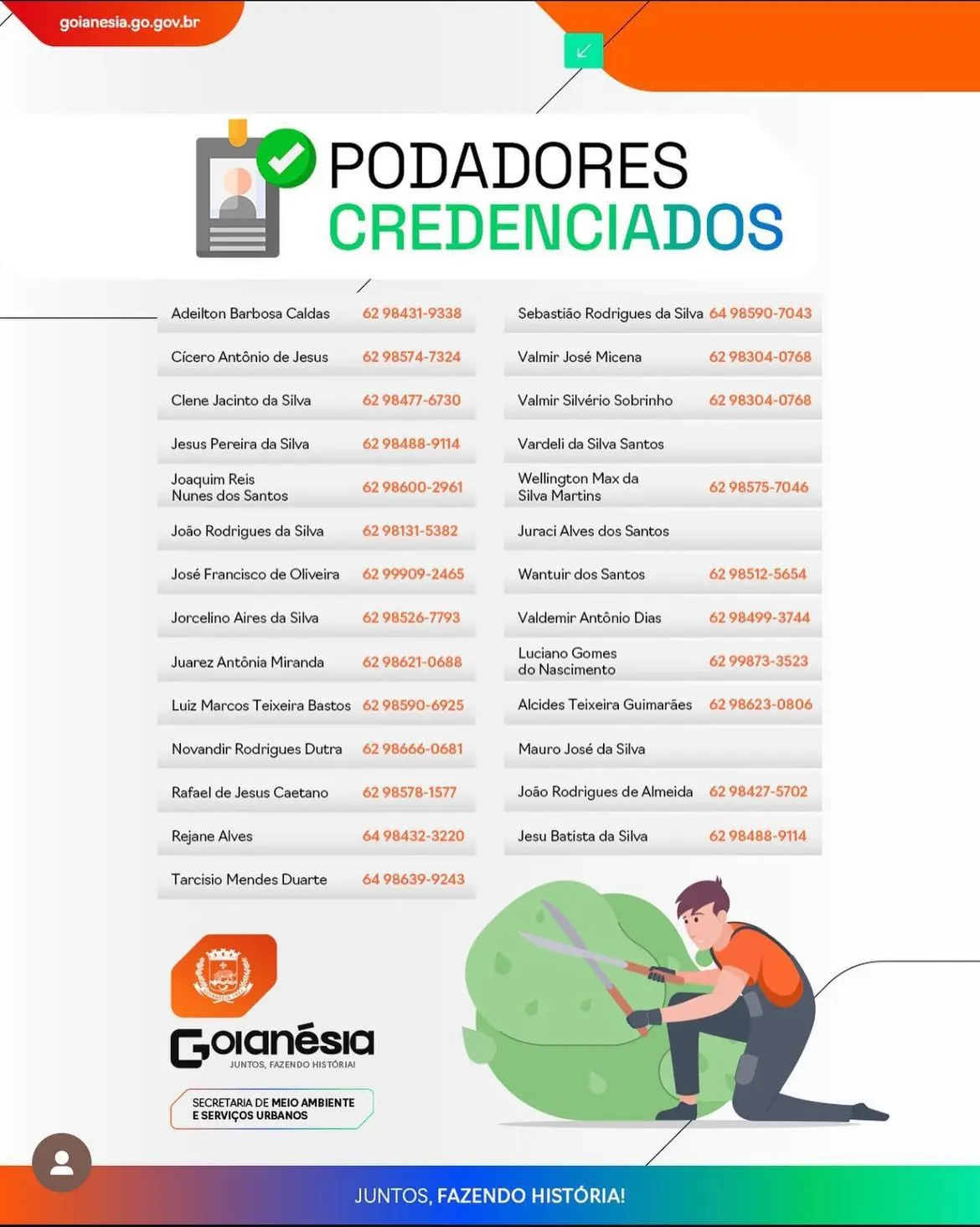 A população pode consultar a lista atualizada de podadores credenciados diretamente na Secretaria Municipal de Meio Ambiente e Serviços Urbanos. No mesmo documento, estão disponíveis os números de telefone de cada profissional, facilitando a contratação de forma segura e regular.