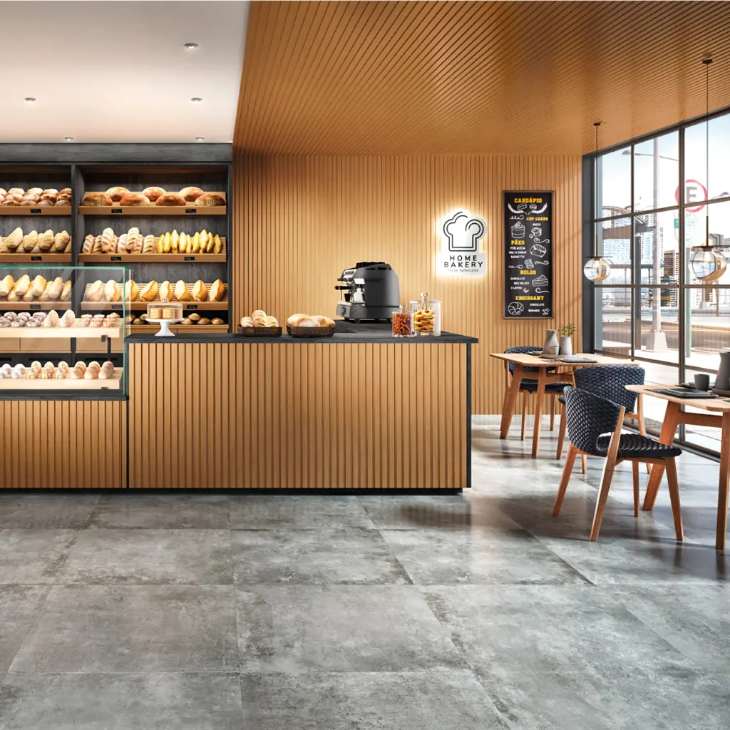 Um dos aspectos mais interessantes dos painéis ripados é sua capacidade de interagir com a iluminação do ambiente. Ao refletir iluminação embutida, eles criam efeitos visuais únicos de sombra e luz.
