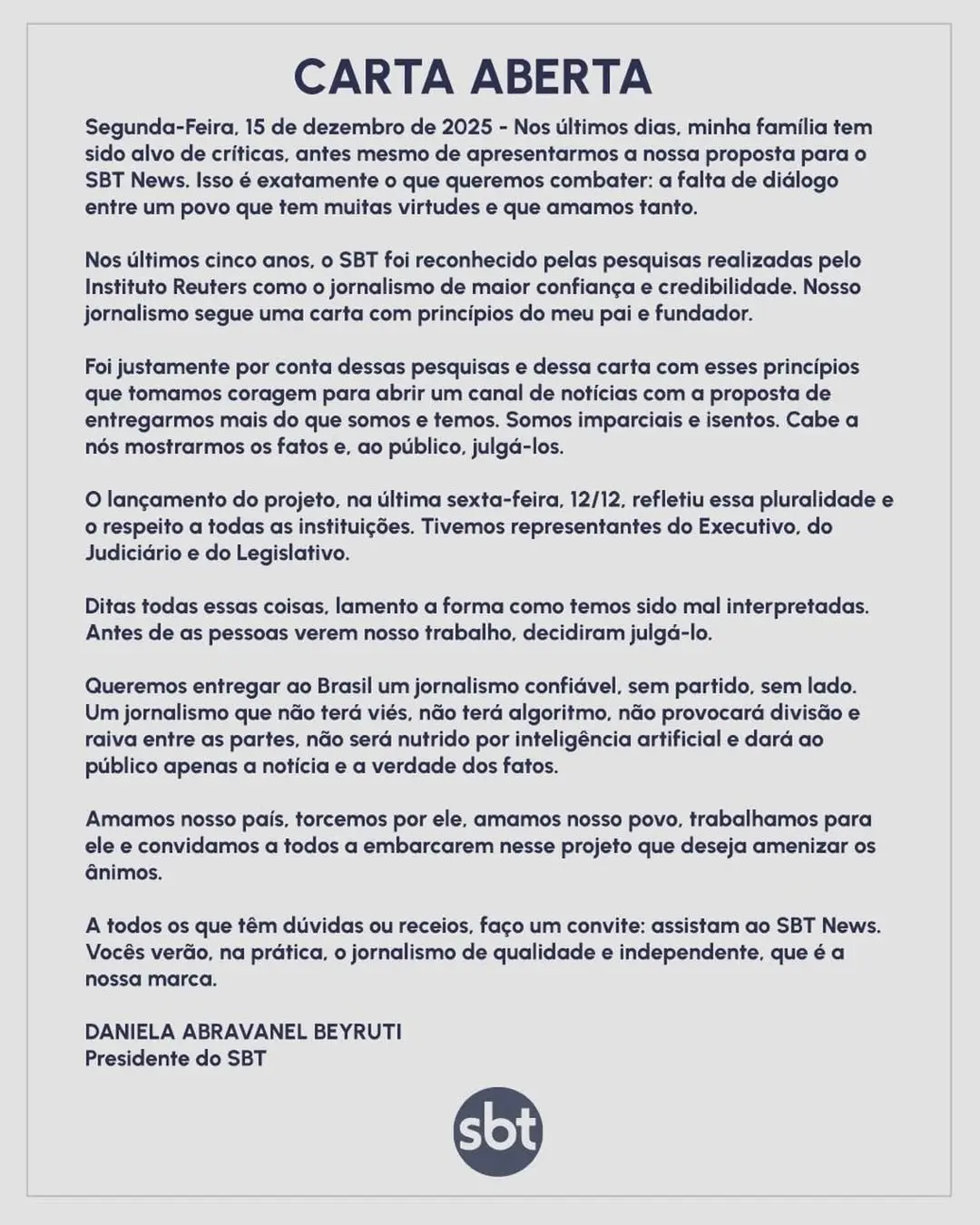Na carta, Daniela Abravanel afirma que, nos últimos dias, sua família tem sido alvo de críticas antes mesmo da apresentação oficial da proposta do novo telejornal. Segundo ela, o objetivo do projeto é justamente combater a falta de diálogo e promover um jornalismo baseado em fatos.