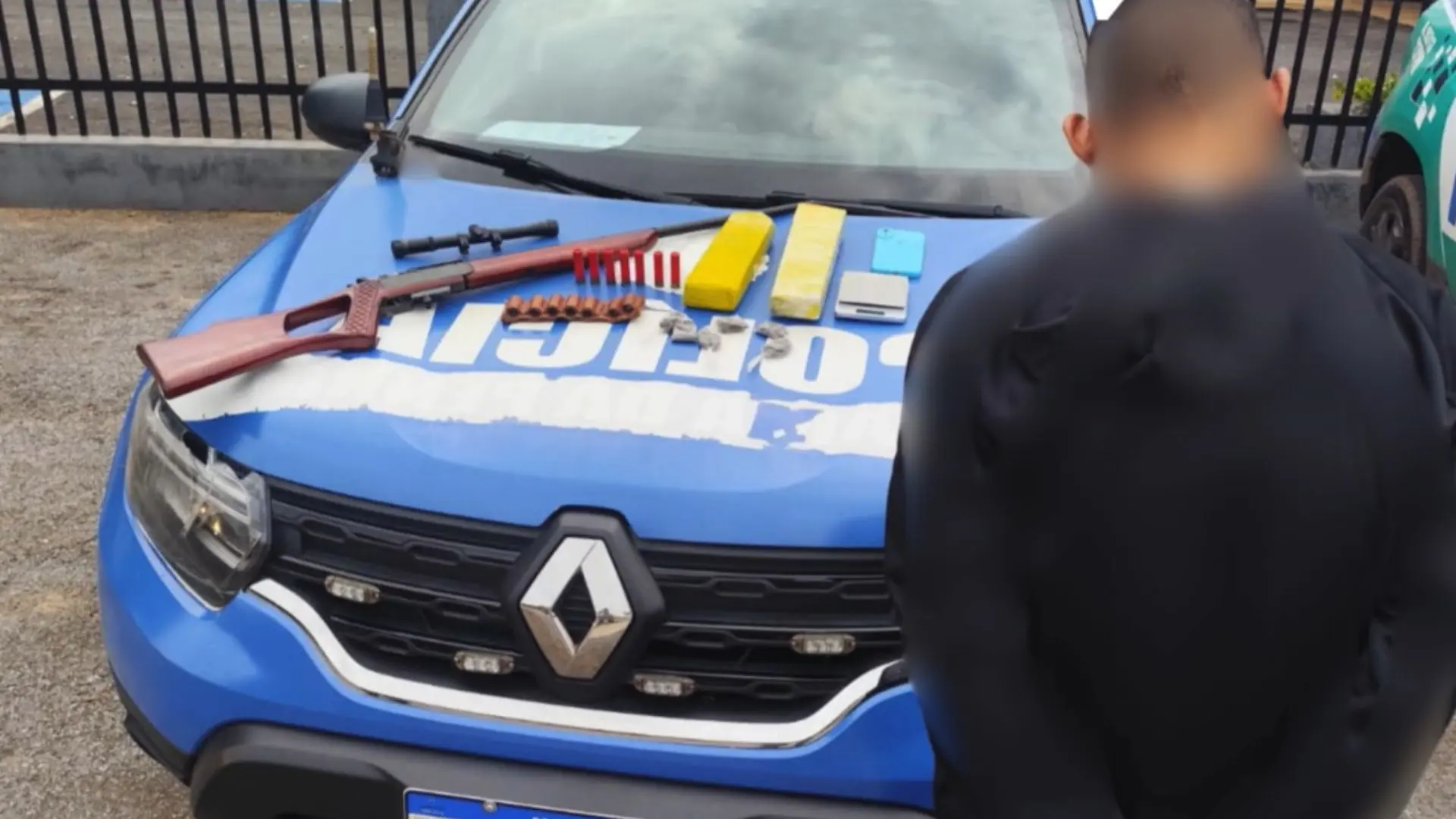 Diante da informação, as equipes se deslocaram até o endereço indicado, onde localizaram e apreenderam aproximadamente 1,7 quilo de maconha, uma balança de precisão, uma carabina calibre .32, sete munições do mesmo calibre e uma luneta. O material reforçou a suspeita de tráfico de drogas, configurando situação de flagrante delito.