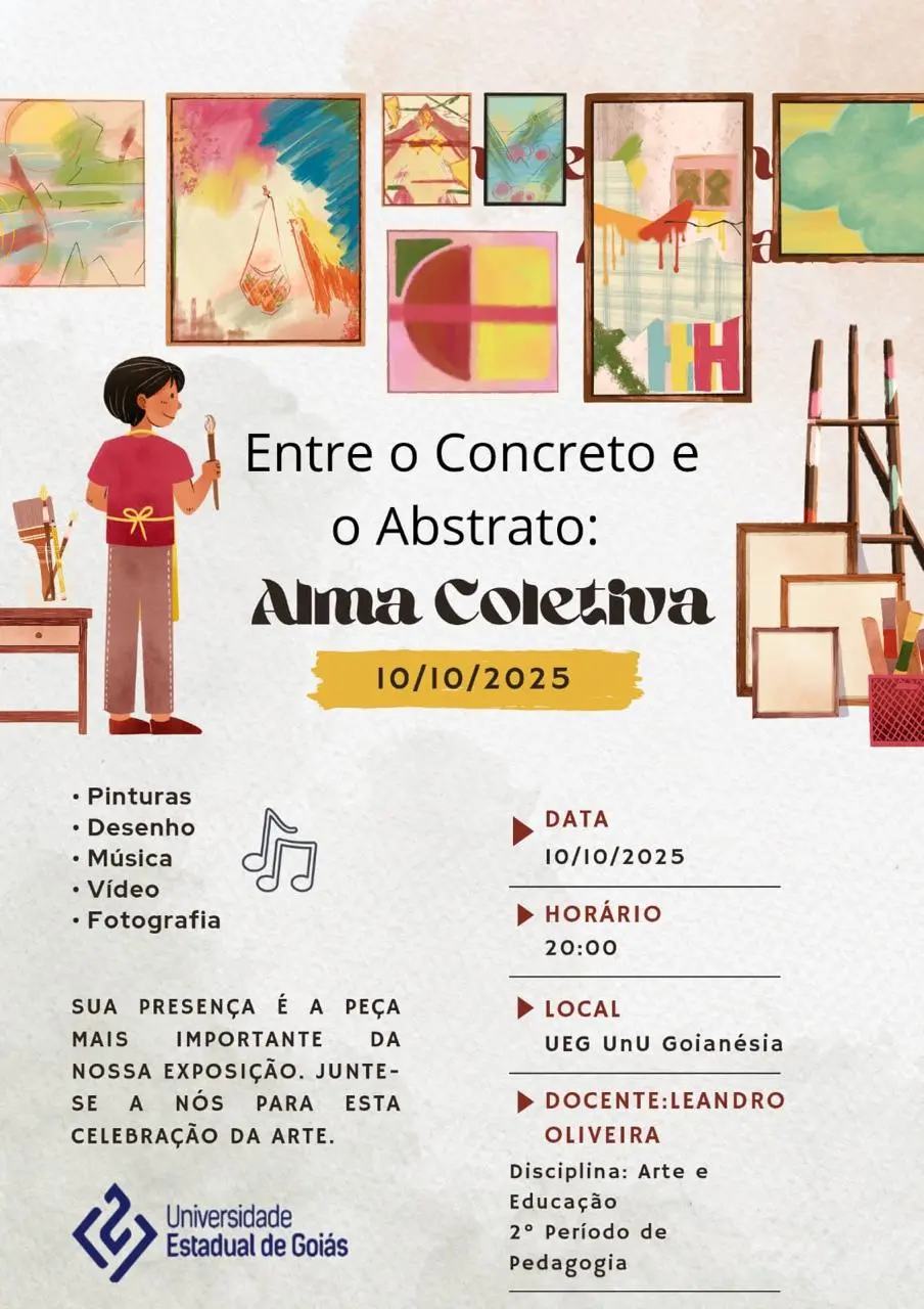 A Universidade Estadual de Goiás (UEG) – Unidade Universitária de Goianésia – promove nesta sexta-feira, 10, a exposição “Entre o Concreto e o Abstrato: Alma Coletiva”, organizada pelos acadêmicos do 2º período do curso de Pedagogia, sob a orientação do professor Leandro Oliveira, na disciplina de Arte e Educação.