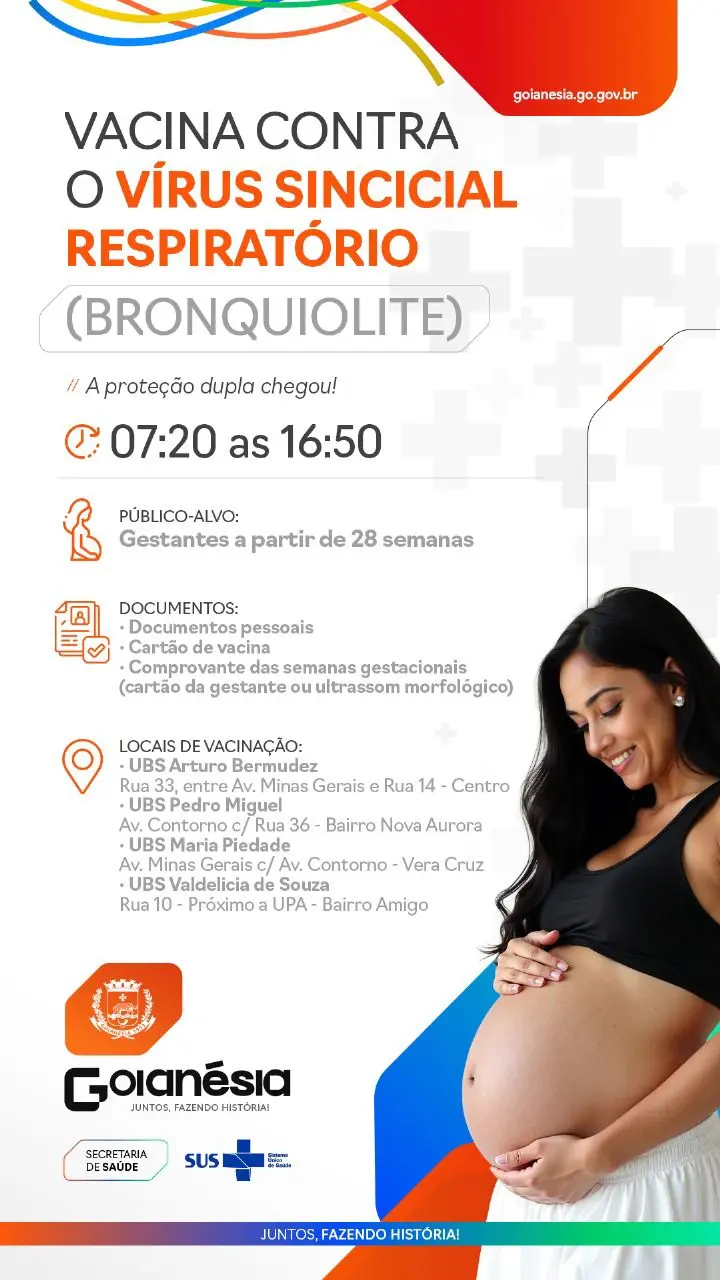A Prefeitura de Goianésia, por meio da Secretaria Municipal de Saúde, iniciou a aplicação da vacina contra o Vírus Sincicial Respiratório (VSR) — principal causador de bronquiolite — em gestantes a partir de 28 semanas. A imunização ocorre das 07h20 às 16h50 em quatro Unidades Básicas de Saúde do município.
